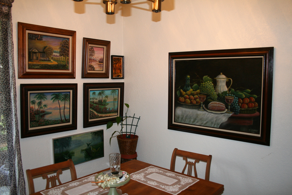 All the paintings are painted by her father, except for the tiniest one - that is from Lithuania and is made of amber.