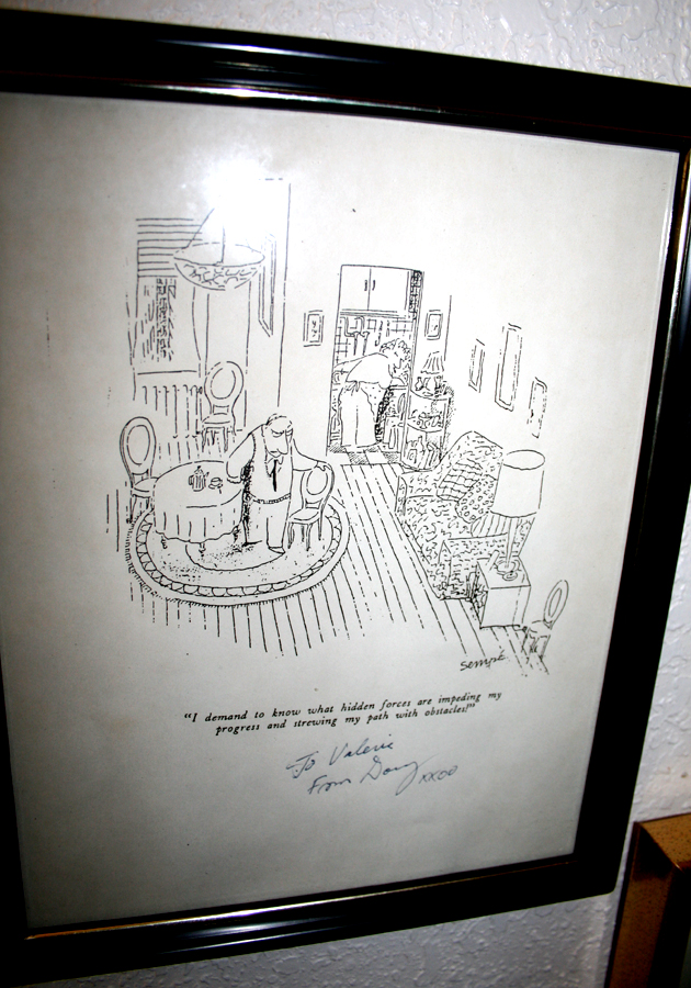 A cartoon on her office wall - her typical sense of humor! ("I demand to know what hidden forces are impeding my progress and strewing my path with obstacles!")