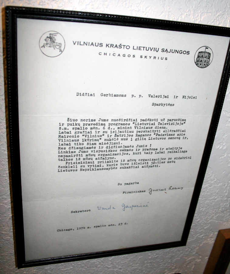 1974 letter from the Vilnius Association, thanking Valerie and Nijole for their readings during their recent commemorative gathering, and awarding them with medals.